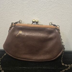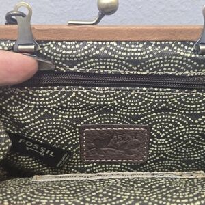 Vintage Fossil Brown leather and multi embroidered coin wallet purse boho hippie with chain strap kiss lock antique brass look removable chain strap approx 7" wide Approx 5" long. Pre-Owned