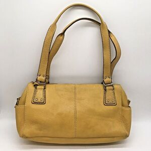 Vintage Fossil, Mustard Yellow, Pebbled Leather, Shoulder Bag with Fossil Key Bag Charm. ZB9961 Authentic Fossil Purse. Double Rolled Top Handles, Zip Top Closure, 2 Magnetic Snap Exterior Pockets and Interior Zip and 2 Slide Pockets.