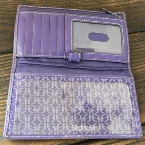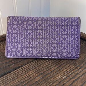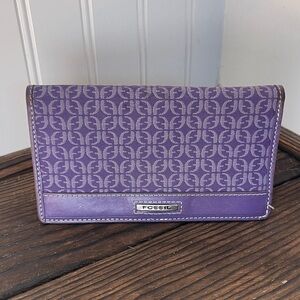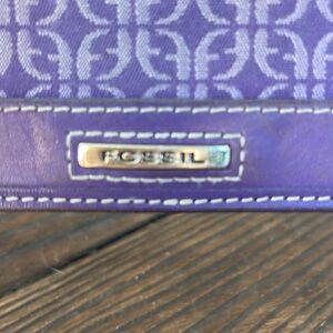 Vintage Fossil bifold wallet in rich purple. Features iconic Fossil pattern and logo accent. Multiple cardholders, cash pocket and zip change pocket, Great condition