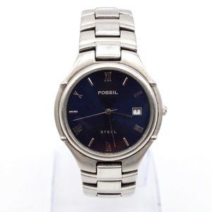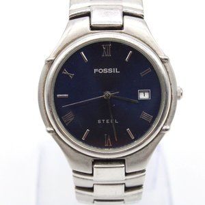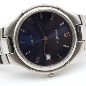 Vintage Fossil Steel Watch Mens Blue Dial Date Analog 36mm FS2701 Stainless Stee