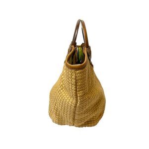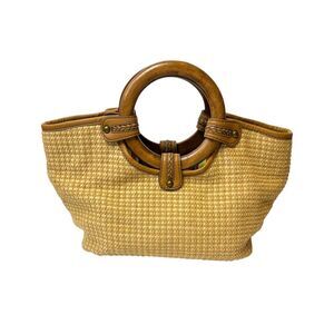 Vintage Fossil Tan Woven Straw Wood Handles Small Satchel Tote Bag Y2K 90’s Boho