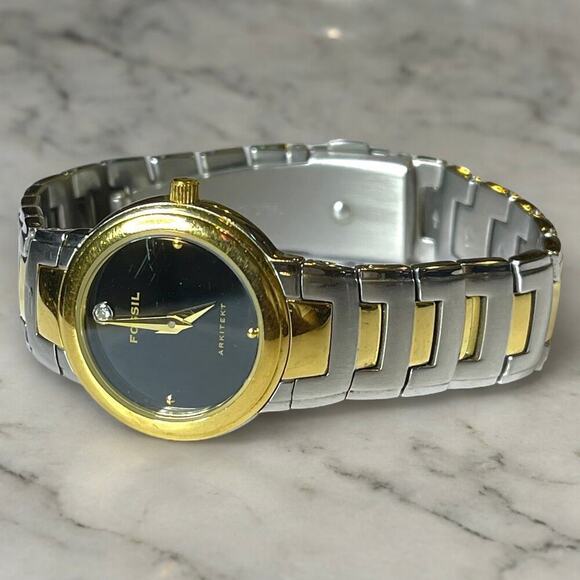 Vintage Fossil Watch Womens Arkitekt Two Tone Stainless Steel Black Dial Rhinestone WORKS