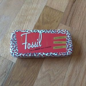 Excellent condition vintage watch and earring set by Fossil in original tin from 1998 as part of the "It's a Jungle Out There!" collection. These are extremely rare--I haven't seen one exactly like this in my research out there. I'm not sure this set was ever used; I can't see a scratch on it, aside the tin. The watch's length is 6 3/4".