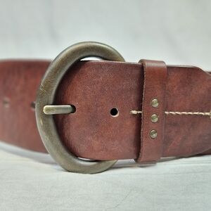 Features brown leather, bronze buckle, bronze studs, wide belt, vintage belt.