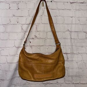 The Fossil 75082 shoulder bag is crafted from genuine leather in a tan/brown color, designed for women. It features a spacious interior, secure zip closure, front flap pocket, and a durable leather strap. The bag measures 14 inches in width and 9 inches in height, with a handle drop of 14 inches. Ideal for casual outings or daily use, this bag combines style and functionality. It is pre-owned with a few stains visible in the photos. Keywords: Fossil, shoulder bag, genuine leather, women's bag, tan, brown, spacious, zip closure, durable, casual, pre-owned, stylish, functional, leather strap, everyday use.