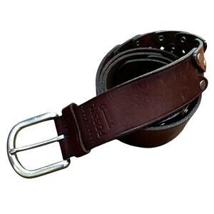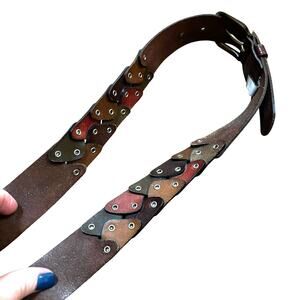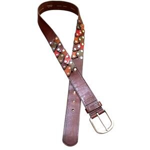 Vintage Fossil brown leather belt - woven multi color leather with silvertone studs and buckle. Colors include mustard yellow, red, sage green and dark purple. This belt is a fantastic retro Boho Festival look. Stamped Size M. Gently worn - great patina on the leather with soft texture - no significant damage or flaws - so cute!