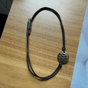 Stylish Fossil bracelet set. Features a silver charm on black cord. Paired with a delicate silver and turquoise bracelet.