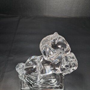 A very handsome horse figurine, originally part of a set of two from the 1940s. This horse figurine displays stunningly from all angles. It will look positively regal as an accent on your bookshelf, desk or side table. Made by Fostoria Glass Company, it was first introduced in the 1940s as part of the Fostoria Animals and Figurines Collection. It has a bit of art deco design look. This great piece has a flowing tail and mane and is hollow inside. Still very weighty. He measures 7.75 inches high, 5.5 inches long and 3 1/8 inch deep. There are no chips, scratches or cracks. For any horse lover or unique vintage glass lover, it will please from any angle in any decor. One figurine. Non smoking pet free home.