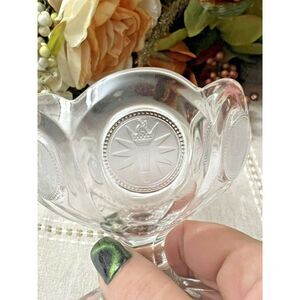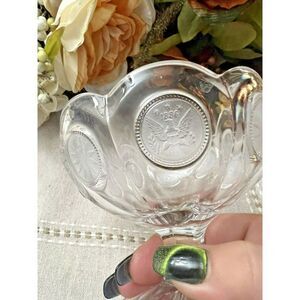 This vintage Fostoria compote is a beautiful piece of American elegant glass. The round shape, crystal-clear color, and coin dot pattern make it an excellent addition to any collection. The compote stands at 4 inches tall and has a diameter of 4 inches. The pedestal model has a single compartment, and it weighs 1 pound. The Fostoria compote was made in the United States between 1960 and 1969. It is an original piece, not a reproduction, and it has an impressed backstamp. The glass material is of high quality, making it an outstanding example of stylish glassware. This particular compote is 3 1/2 inches in height and 4 1/2 inches in width. Thank you for shopping in my store. Please note most items I sell are vintage and pre-owned, I will try to show any wear in pics. I do offer combined shipping and am open to reasonable offers. Please message me to combine shipping before you purchase.