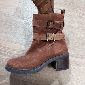 Vintage Foundry Charmaine Buckle Boots in Brown, size US 7.5. Zip into the Charmaine bootie from Vintage Foundry Co. for versatile appeal. Decorative buckles, a chunky block heel, and lug sole keep this suede ankle boot right on trend.