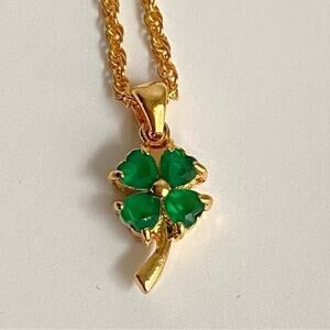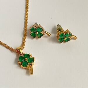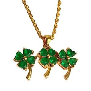 Vintage Four Leaf Clover Necklace & Earrings Set 18K Gold Plated Lucky Green