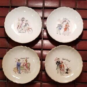 Vintage Four Mini Porcelain Plates Featuring Victorian Couple & Romantic Phrases