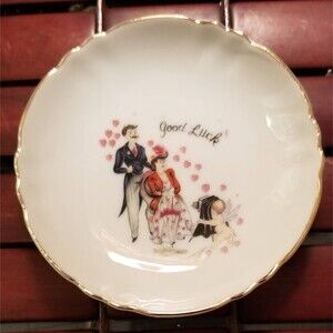 Vintage Set Of Four Mini Porcelain Plates Featuring A Victorian Couple & Romantic Phrases I Love You Take It Easy Good Luck Happy Days