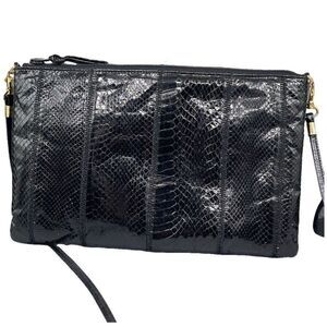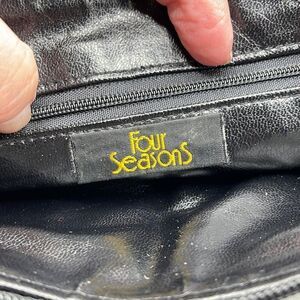 Vintage Four Seasons reptile skin cross body vintage 70’s 80’s.It is by Four Seasons and is black reptile skin exterior and smooth black leather interior. One sidewall zippered pocket. The 19” drop on strap that is removable. Minimal wear and very clean