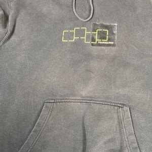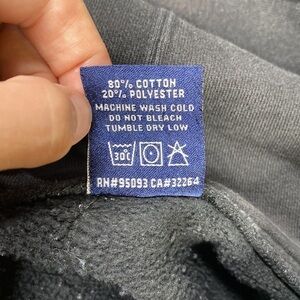 Discoloration on front with seam separation of kangaroo pocket, see last three photos for condition.