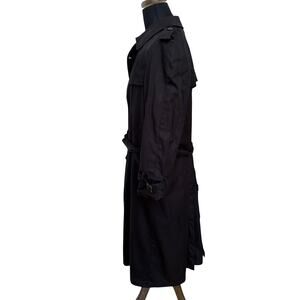 Classic vintage trench coat in black with double-breasted button front and belted waist. Features shoulder epaulets, adjustable sleeve straps, storm flap, and removable quilted zip-out liner for added warmth. Made in Taiwan R.O.C. Durable cotton-poly blend shell with water-resistant qualities. Perfect for timeless outerwear styling—suitable for casual, business, or retro-inspired looks.