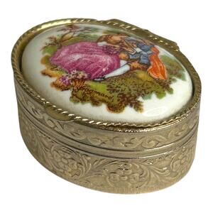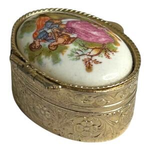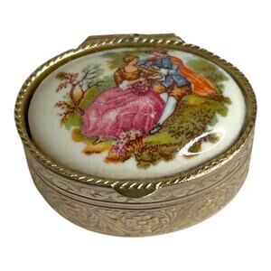 Vintage Fragonard Style Porcelain Top Gold Tone Vintage Trinket Box Pill Box