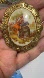 Step into a bygone era with this ornate brooch, showcasing a romantic scene inspired by Fragonard. The golden frame adds a regal touch to its timeless charm.