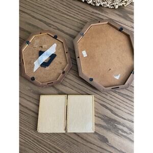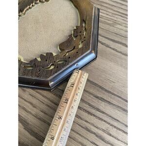 Gorgeous 1960 faux wood (plastic) frame set with floral cut outs. Original stock photo in one and gold paper inlay in both. The large one has some damage - see photo - and is missing the stand because it was hung on the wall.