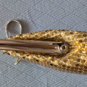 Gold color, with white and gold metal frame, gold sequin mesh. From the 70's maybe?... but not positive. Made in Hong Kong.