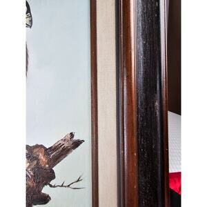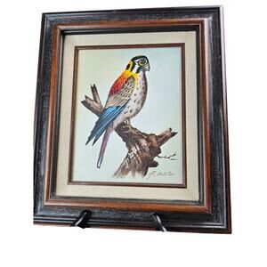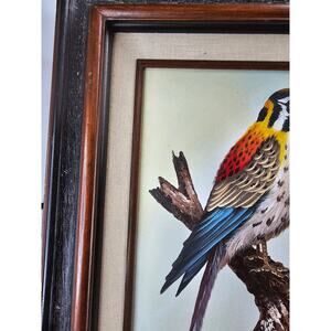 Keywords: bird painting, framed art, vintage painting, original artwork, exotic bird, wall decor, signed painting, bird on branch, rustic decor, home decor, art collectible, vintage art
