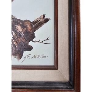 Original framed bird painting, a captivating piece of wall decor, features a vibrantly colored exotic bird perched gracefully on a textured branch. The artwork is signed by 'G. A. D. Sexi' creating a unique blend of visual appeal and artistic expression. Encased in a dark wood frame with a lighter inner border, this painting exudes vintage charm. It would make a striking addition to a cozy living room, a tranquil study, or a nature-themed gallery wall.