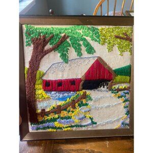 Vintage Framed Crewel Covered Bridge Scene Wall Art 15"x15" Rustic Decor Handmad