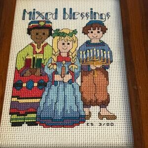Vintage Framed Cross Stitch Mixed Blessings Cultural Diversity Holiday 9.5x7.5