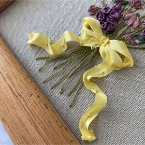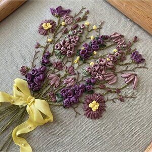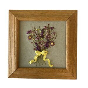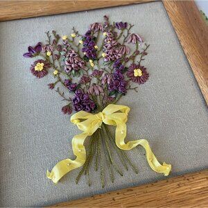Bring a touch of vintage charm to your space with this beautifully hand-embroidered floral bouquet artwork. The design features intricate stitched flowers in purple, mauve, and yellow tones tied with a cheerful yellow ribbon, all displayed against a neutral linen background. Housed in a solid wood frame, this timeless piece adds a warm, cottagecore, shabby chic, or farmhouse aesthetic to any wall.