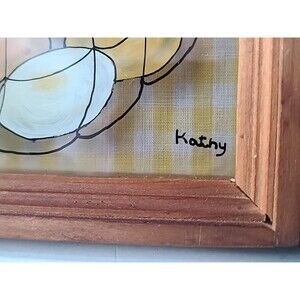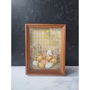 This is a vintage framed shadow box art with painted glass featuring the image of "Fresh Eggs."
