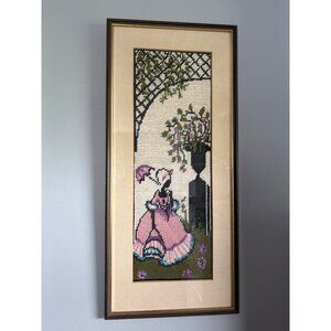 Step back in time with this vintage needlepoint piece, capturing the grace of a Victorian lady in a lush garden. Framed elegantly, it brings the charm of yesteryears to your home, offering a window into the past with its meticulous craftsmanship and classic elegance.