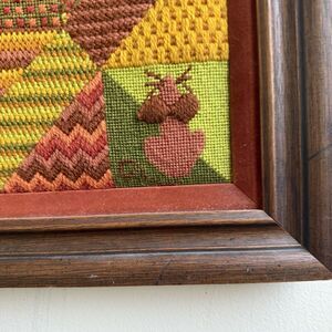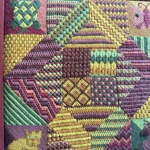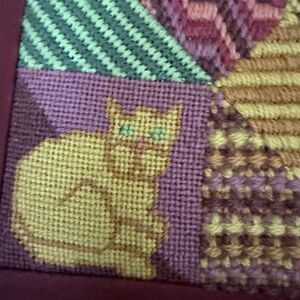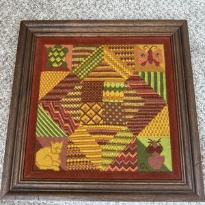 Vintage Framed Needlepoint Quilt Crewel Square Grannycore Cat Turtle Butterfly