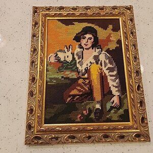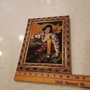 Vintage Framed Needlepoint Sir Henry Raeburn Boy & Rabbit Ornate Gold Frame