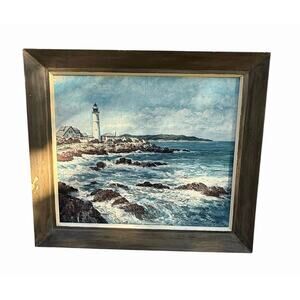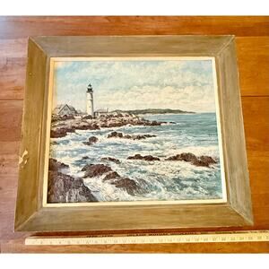 Add a touch of coastal charm to your home with this beautiful vintage oil on canvas painting depicting the iconic Portland Head Lighthouse. This piece captures the serene essence of Maine's rocky coastline, showcasing the soft hues of the ocean and sky, and is sure to evoke a sense of tranquility in any setting.