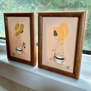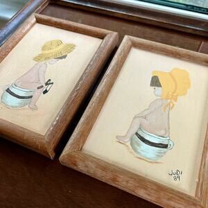 Pair of charming vintage framed paintings, each depicting a young child sitting on a chamber pot. One features a boy in a straw hat holding shoes, and the other a girl in a yellow bonnet. Both are signed “Judi ’89” and set in simple wood frames. In very nice vintage condition.