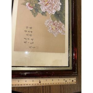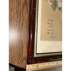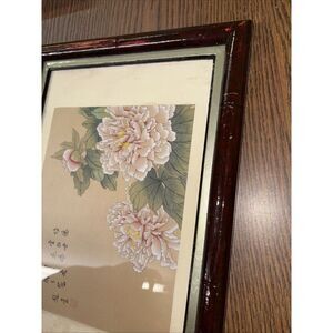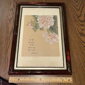 This is a vintage framed floral art piece on what looks like (but not guaranteed to be) silk, featuring an Asian influence. Very cool piece!
