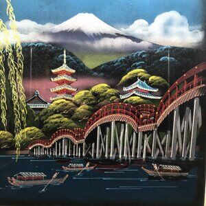 This exquisite vintage framed velvet painting captures a serene Japanese landscape featuring the majestic Mt. Fuji in the background. The artwork showcases traditional pagodas, a gracefully arched bridge, and boats gently floating on a tranquil river. The vibrant colors and intricate details bring the scene to life, making it a captivating piece for any art collector or enthusiast of Japanese culture. The painting is framed in a sturdy, elegant frame that complements the artwork beautifully. This unique piece is perfect for adding a touch of sophistication and tranquility to any room.