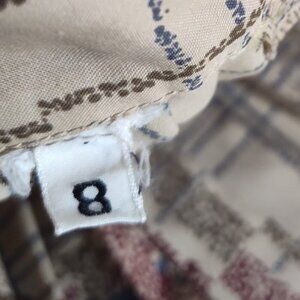 The way it is made you would think it has shoulder pads but it does not, nor as far as I can tell never had them. There are belt loops but no belt. One main tag, and no tag with material or wash instructions. The skirt says size 8 but it is a 25" waist so I listed as size 2. I could barley fit it on my mannequin. The tag is one from Frances Henaghan's 1970's line of clothing. The material is soft, like cotton, but has a little stiffness so I think it may be a blend. The top has fabric to make a bow or maybe tie it like a tie. The skirt falls a little below the knee.