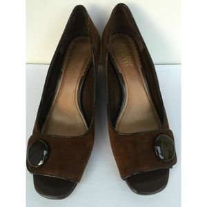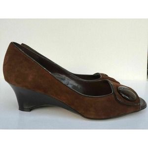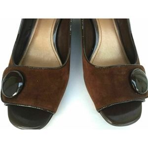 Vintage Franco Sarto Heels Brown Fine Leather Suede Open Toe Wedge Button 8.5 M