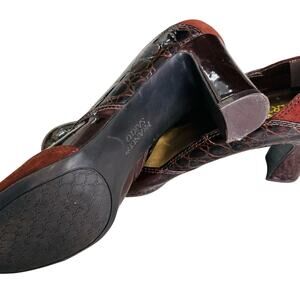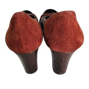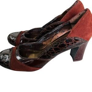 The product is a vintage early 2000s Franco Sarto brown round toe chunky heel pump in size 9.5. These stylish heels are perfect for a party or cocktail event, with a classic pump style and a comfortable leather upper material. The chunky heel adds a trendy touch while the brown color makes them versatile for various occasions throughout the summer, fall, and spring seasons. Made by the renowned brand Franco Sarto, these shoes are a timeless addition to any woman's wardrobe. The mixed suede and alligator leather print are to die for. Barely used condition!