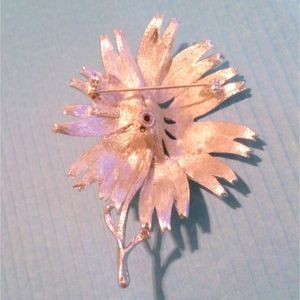 Crafted by the renowned artisan Francois, this exquisite Vintage Signed Silver Tone Icy Blue Enamel and Rhinestone Flower Brooch epitomizes timeless elegance. The brooch boasts a lustrous silver finish, accentuated by delicate icy blue and white enameling that gracefully adorns its petals. At the heart of this botanical masterpiece lies an oval prong-set light blue rhinestone, radiating a subtle yet captivating sparkle.
