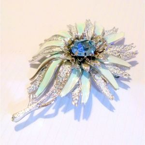 Vintage Francois Signed Silver Tone Icy Blue Enamel and Rhinestone Flower Brooch