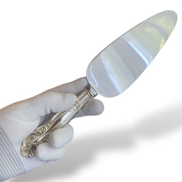 Serve in timeless style with this vintage cake or pie server featuring a sterling silver ornate handle and a Sheffield stainless steel blade. Made by Frank M. Whiting, a respected American silversmith, this piece measures approximately 10 inches long and carries an elegant, traditional design.
