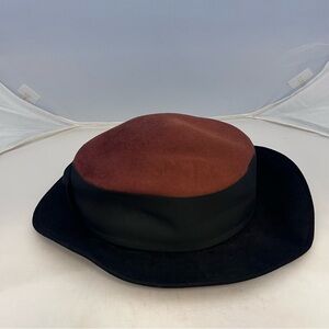 This is a really cool vintage brown and black bucket hat from Frank Olive. Sold at Saks 5th Avenue and the tag looks to be from the 1960s. Black bow at the band and 100% wool. Made in USA. No size listed anywhere on the hat and it measures approximately 22 inches in circumference. Really great vintage hat.