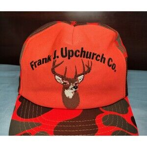 - The Vintage Frank Upchurch Co Deer Hunting Snapback Cap Hat in Orange is a high visibility accessory perfect for outdoor activities like hunting, hiking, or camping. With a camouflage pattern featuring a deer character, this hat is both stylish and functional. Made of lightweight microfiber fabric, it is lined and insulated for added comfort. The adjustable baseball cap style ensures a perfect fit for both men and women. Made in the United States, this vintage hat is a unique and practical addition to any wardrobe, suitable for all seasons