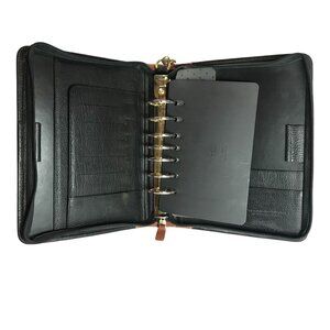 This Franklin Quest planner is crafted from high-quality leather, offering durability and a sophisticated appearance. It features multiple card slots and a binder mechanism for organizing documents efficiently. The planner's compact size makes it suitable for carrying in briefcases or bags, catering to professionals needing organization and easy access to essential materials.