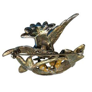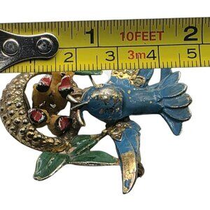 This vintage 1930's brooch features a beautifully crafted blue bird with a nest and chicks, accented with gold-tone enamel for an antique aesthetic.