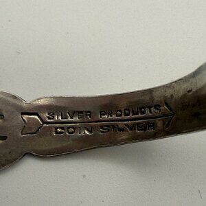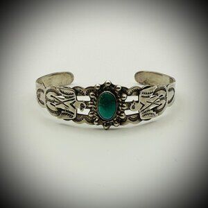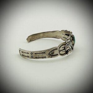 This vintage cuff bracelet is crafted from coin silver (900) and stamped with the hallmark “Silver Products Coin Silver” inside an arrow. The bracelet features a classic Fred Harvey era design with detailed stampwork including arrows and thunderbird-style motifs, surrounding an oval turquoise cabochon at center.