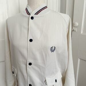 Vintage white, navy blue, and maroon red Fred Perry track/bomber jacket. Nice and lightweight with a collar and full snap button closure. Classic laurel wreath design on the front and twin striped trim. Two pockets in the front. In good vintage condition with a small mark (pictured). This was well taken care of over the years!