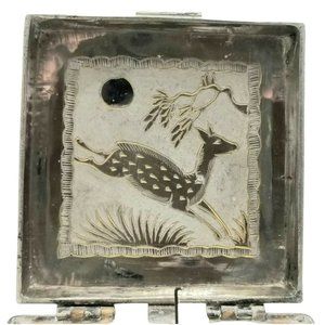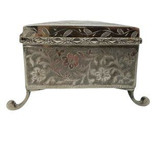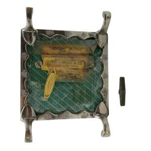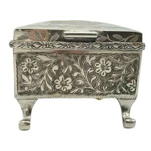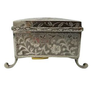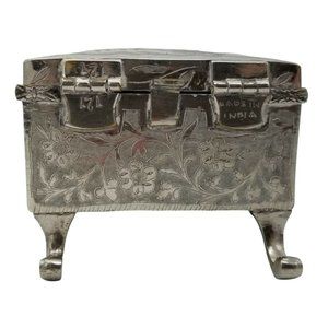 No two Fred Zimbalist music boxes are alike. This one, made in India, has a sailboat, trees, birds and moon on the top cover and a jumping deer on the inside of the cover. The sides have a flower and leaves design. This is hand tooled and etched. The box is silver nickel plating on brass with cabriole legs. The Thorens Movement plays "Anniversary Song". The winder has been replaced with a new brass one. The older one is shown in the last photograph and will be included but the threads on it are stripped. The original owner taped the music box information on the bottom. It reads "THORENS Movement" "Anniversary Song" "FRED ZIMBALIST & CO." "SWISS MUSIC BOXES" "Cleveland 5, Ohio". Five digit zip codes were established in 1963 so I believe this box was manufactured prior to that. There is also a notation to not overwind but this is mostly illegible. The tape and paper are yellowed and brittle. The back hinges are marked "727" and "MADE IN INDIA". The movement is marked "THORENS MADE IN SWITZERLAND" and "5". The size is 3-1/4" x 3-1/4" x 2-1/2" high.